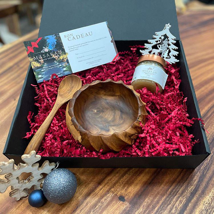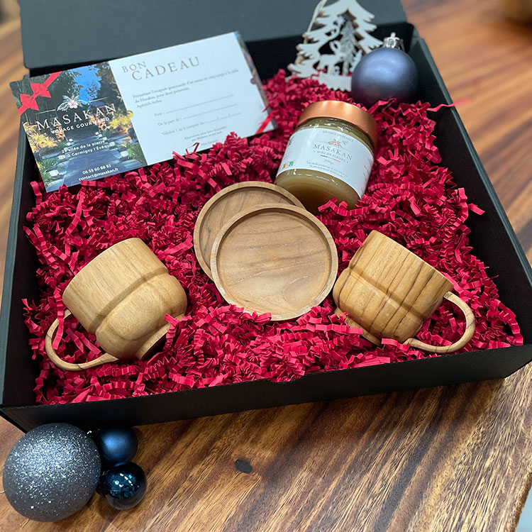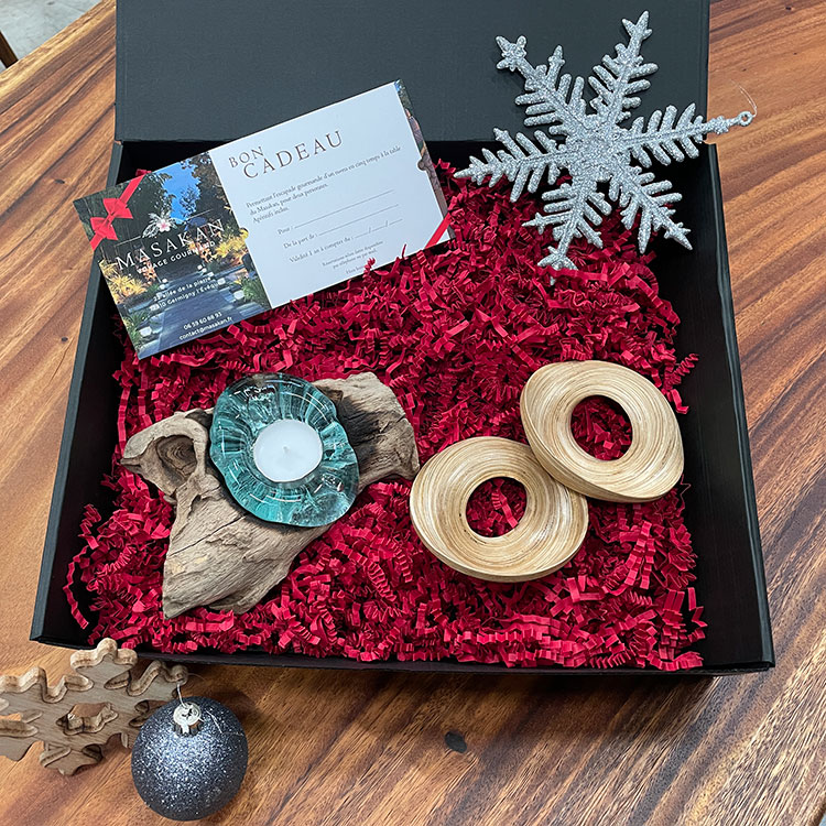 Chaque coffret renferme des trésors artisanaux importés directement de Bali, des objets faits main par des artisans locaux, qui apporteront une touche d’élégance et de chaleur à vos moments de fêtes. En plus de ces pièces uniques, vous trouverez un pot de miel pur, récolté sur place dans les jardins du restaurant Le Masakan, ainsi qu’une carte cadeau, en solo ou en duo, pour vivre une expérience culinaire inoubliable.